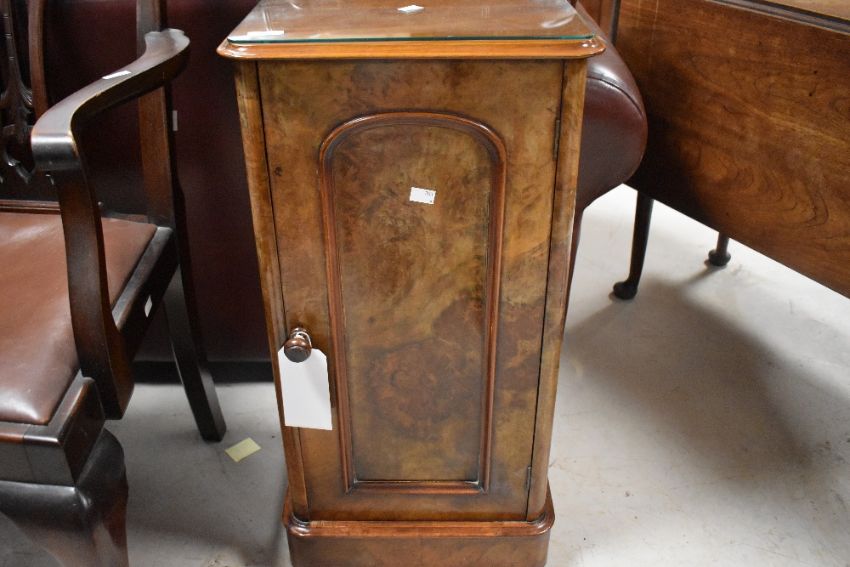 A 19th century figured walnut bedside cupboard, of traditional design with moulded and rounded rectangular top over a single door with arched panel and plinth base 69cm x 38cm x 32.5cm