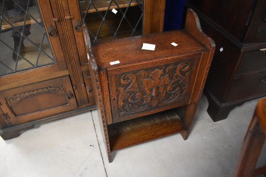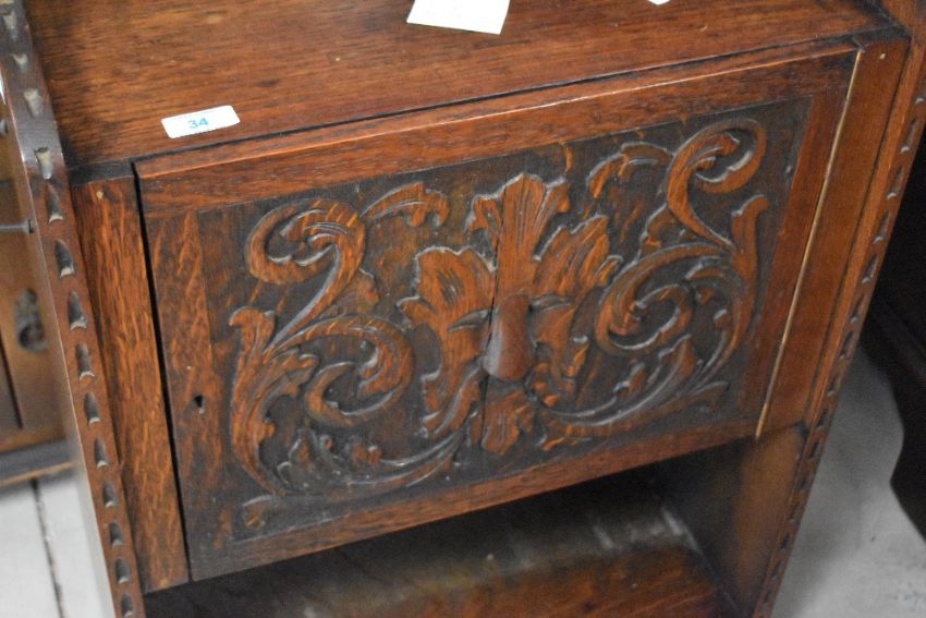 A small late Victorian oak free standing cupboard, having a stipple carved 'Green Man' design cupboard door between shaped and notch decorated ends with under shelf, 65cm x 50cm x 21cm