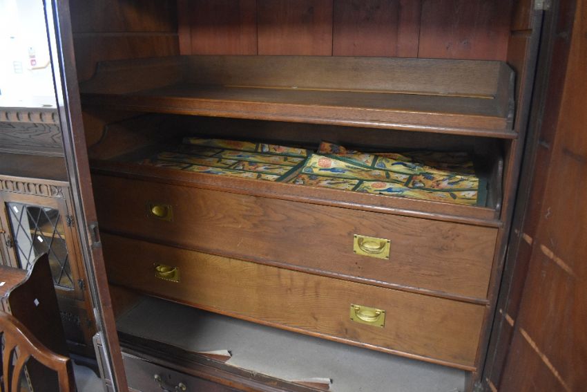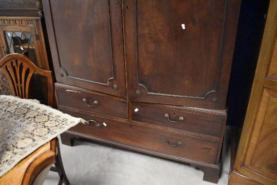 A George III mahogany press cupboard, having a dentil moulded frieze over two re-entrant panelled doors, enclosing the internal slides and drawers, the base section with 2/1 cockbeaded drawers with brass bale handles, on bracket feet 180cm x 130cm x 64cm