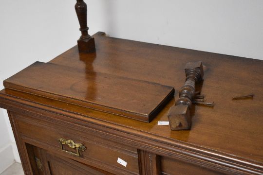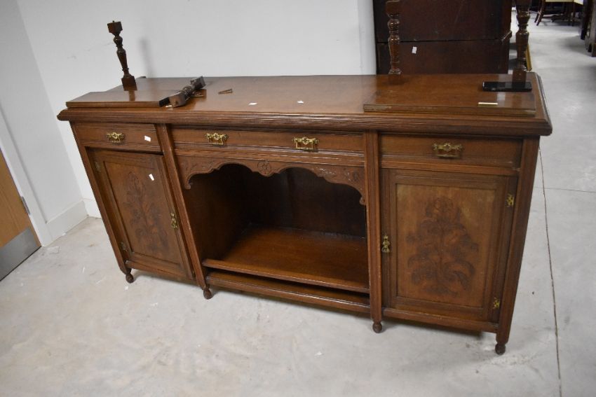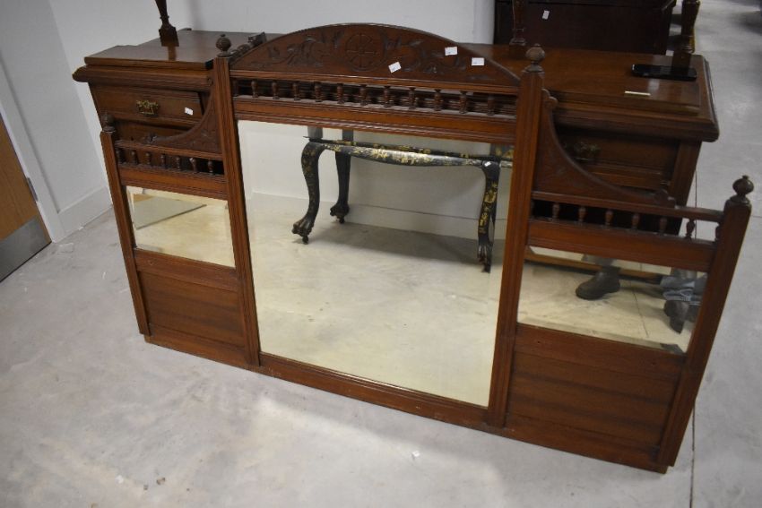 A late Victorian oak mirror back sideboard, of typical arrangement with three bevelled glass plates over central dog kennel section and cupboard doors 198cm x 18cm x 55cm top will require some assembly