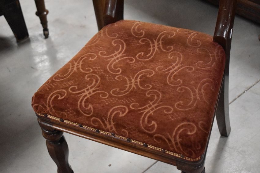 A pair of Victorian mahogany dining chairs, having concave scroll end top rails over scrolled mid rail and padded seat, raised on faceted baluster front supports seat height 47cm