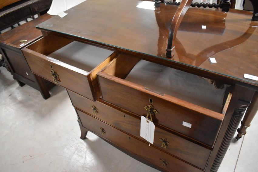 An attractive Edwardian mahogany chest of two over three cockeaded drawers, each with cruciform brass back plates and pendant handles between reeded quarter columns and raised on splayed bracket feet 97cm x 100cm x 48cm
