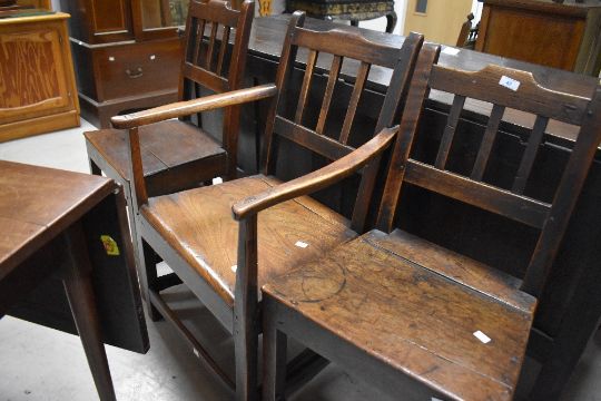 A group of three 18th century oak chairs, two single and one carver, each with shaped top rail and vertical splats, the solid seats raised on square section supports linked by stretchers,