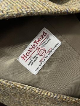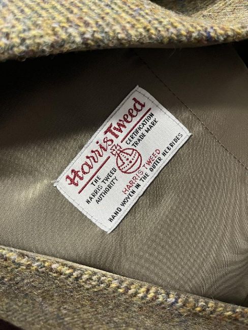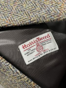 Three Harris Tweed waistcoats in brown and dark green herringbone wool, including a Glenalmond of Scotland example, woven leather buttons, sizes L-XL.
