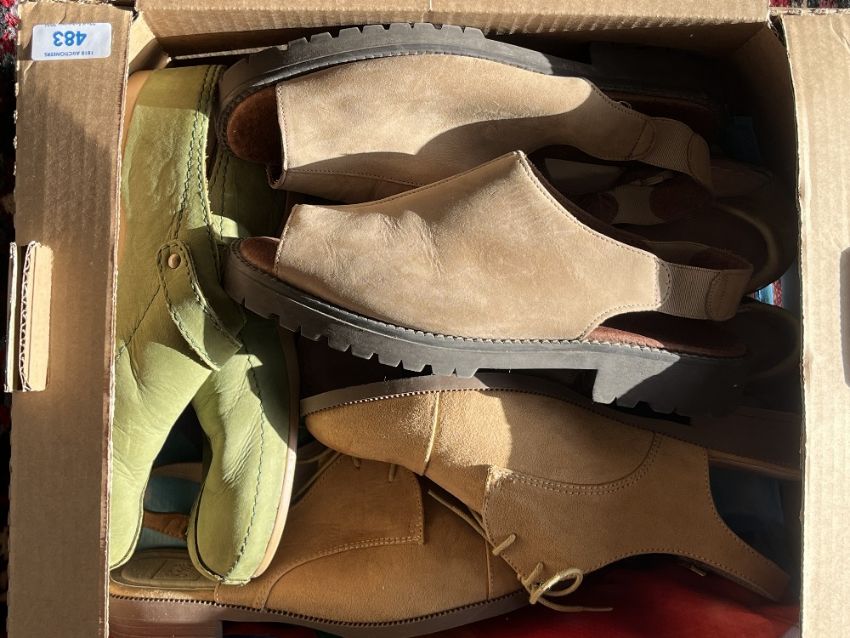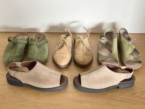 Three pairs of vintage ladies sandals and a pair of tan open heeled brogues, to include vintage Marks and Spencer taupe slingbacks, Brevett and Riva sandals in green, sizes 6.5 - 7.