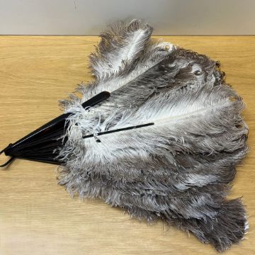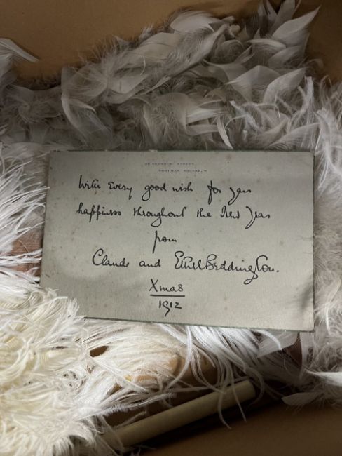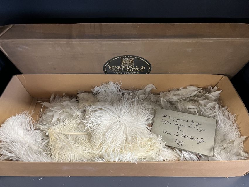 A Marshall and Snellgrove giftbox enclosing Alencon or Chantilly lace square measuring approximately 32 x 35 inches, handmade silver cord and wax flower crown, with two lengths of mesh gauze dressmakers fabric, assorted ostrich feather handheld fan, french combs, feathered headband and hairpins, along with a Christmas card showing provenance, signed Claude and Ethel Beddington.