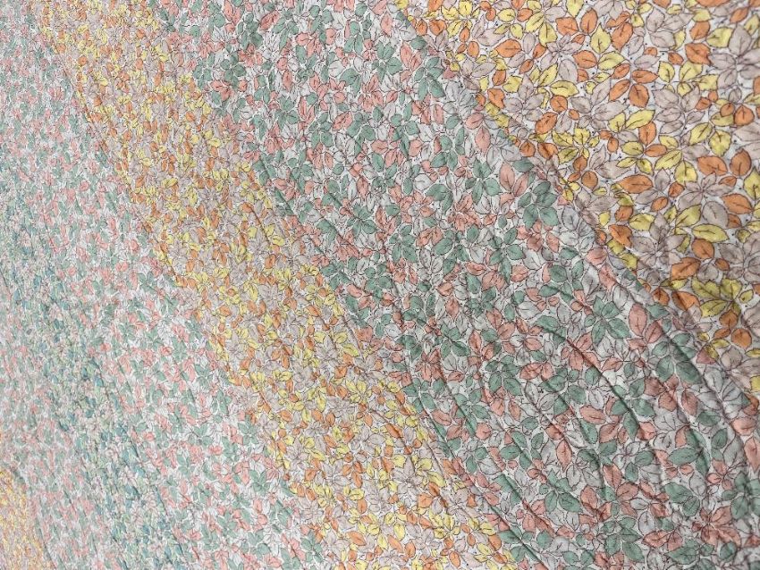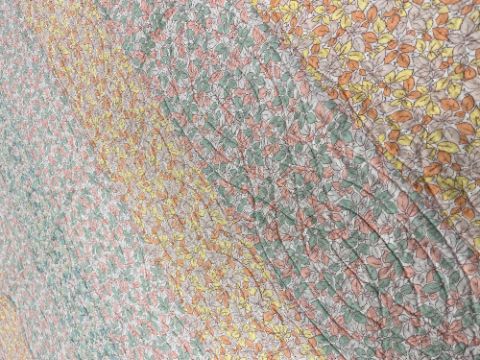 A rare unused 1950s handmade patchwork quilt combining wide stripes of three stunning pastel colour-ways of the same ditsy leaf print fabric, in yellow, orange, pink, green and blue on a white ground, curved intertwining hand stitched quilting design, measures approximately 70 x 84 inches overall, in unused condition with no damages or repairs.