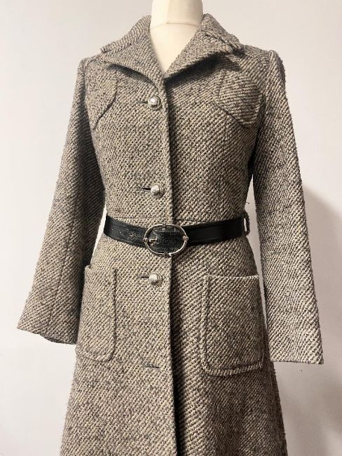 A 1960s 50% wool coat by Mono, Made in England, in woven beige and taupe with subtle military details such as patch pockets and wide notched lapels, size S, lovely condition.