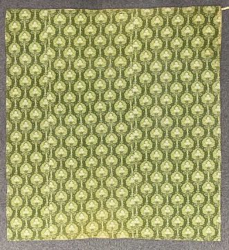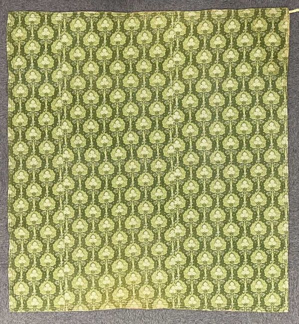 An antique Welsh quilt featuring unusual and rare fabrics, a green with celtic-style tree of life pattern, and a pink with ribbons and roses, arranged in wide stripe patchwork, with all over stitched quilting, measures 78 x 76 inches approximately, has some sun fading around the border edges, otherwise majority in lovely vibrant condition, no repairs.