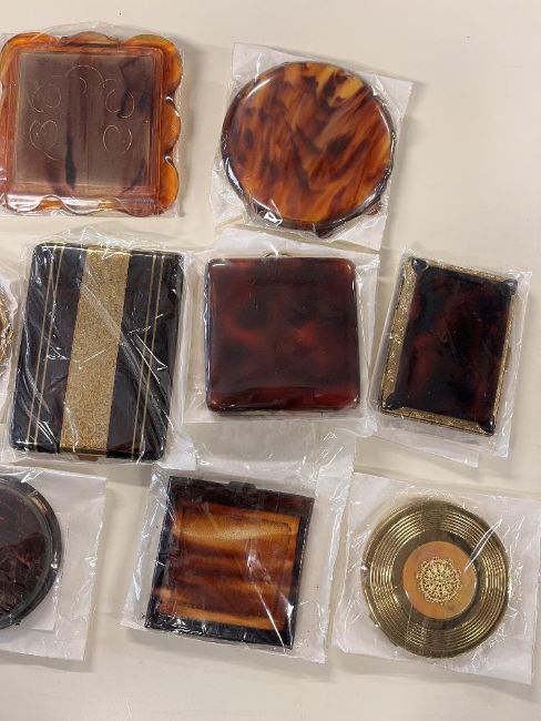 Assorted 20th century vintage compacts in tortoiseshell and imitation tortoiseshell, to include Stratton, Mavco hand painted, Zeigfeld Petticoat Girl, a cigarette case, thirteen in total.