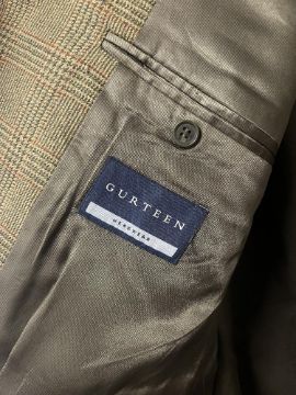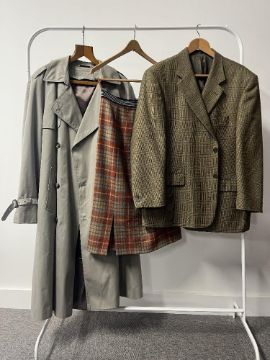 Three vintage woolen garments, to include a Dannimac Premium Collection rain trench in grey, with detachable wool & satin lining, measures 22' across from pit-to-pit and 48 inches total length, along with a handmade wool skirt in terracotta, green and blue tartan with elastic waist band, size XS, 25 inch waist and 28 inches length, and a Gurteen Menswear from Armisons of Penrith wool single-breasted blazer jacket in khaki brown with red accent tweed, size XL, measures 25 inches across the back from pit-to-pit.