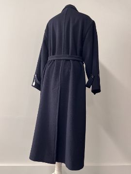 A vintage JAEGER cashmere and wool long coat in deep navy, featuring a belted wrap-tie styling, notched lapels, buttoned cuff detail, size 10, 50% wool, 40% cashmere and 10% polyamide, in lovely condition.