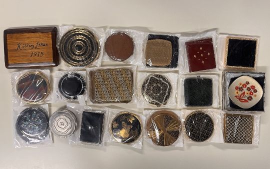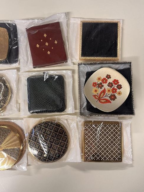 Assorted 20th century vintage makeup compacts and cases, with retro designs such as 60s floral, plaid, padded, faux leather, engine turned and encrusted.
