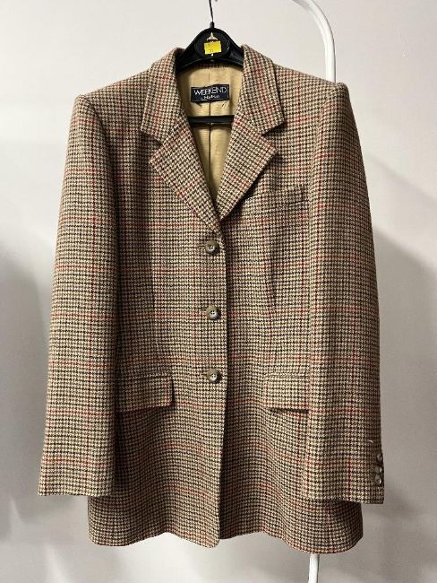 Three 1970s designer vintage wool and tweed garments, to include an Aquascutum plaid and pleated knee length skirt in camel with brown and black houndstooth weave, a Weekend by MaxMara plaid jacket in camel with red and brown houndstooth weave, and a Dressage by Paul Costelloe tweed jacket in teal green and taupe herringbone, all size M, in lovely condition.