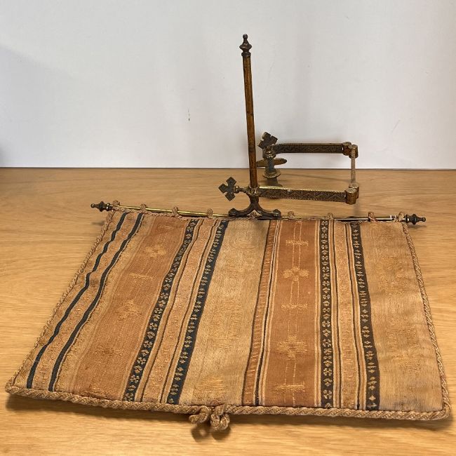 A 19th century antique tapestry screen with adjustable bronze bracket, dated to 1867, fabric measures 16 x 13 inches, bracet fully extended measures 17 x 11, with approx 2.5 inch gap within clamp.