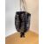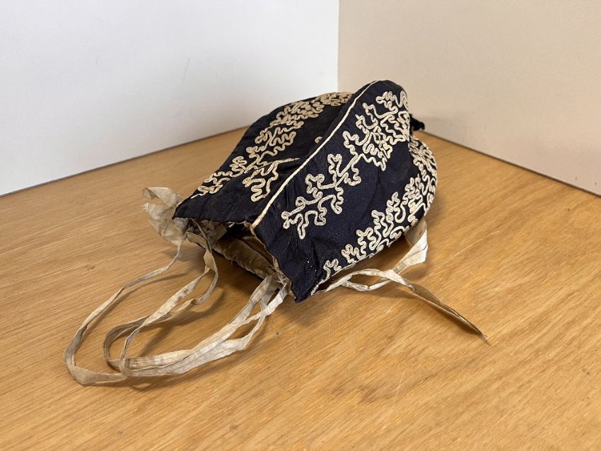 A Regency period reticule purse in black taffeta with ivory cord embroidery depicting curling ferns, having a three panel construction, ivory piped seams, a black silk pompom tassel which hangs beneath, ivory silk lining and ivory ribbon handle and tie closure, measuring 6 x 10 inches approximately.