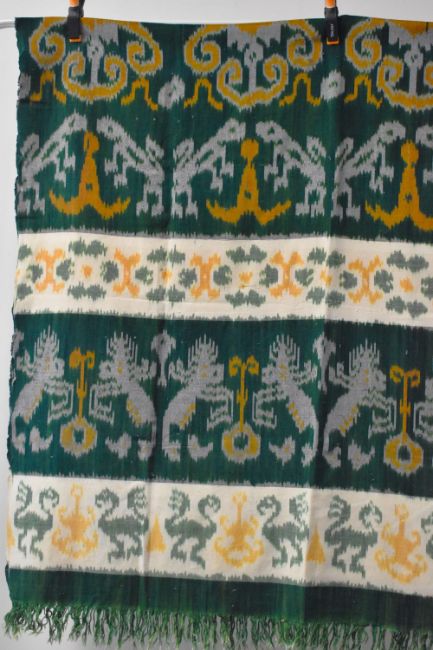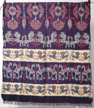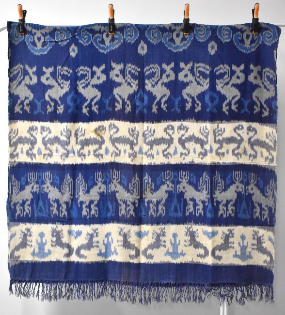 Five 20th century Indonesian Ikat Hinggi cloths, sarong or hangings, depicting shrimp, deer, mythical figures, denoting royalty and ceremony, with stripe and honeycomb geometric pattern through unique weaving techniques and motifs known to be performed by the Ambon island tribes. Extremely soft and pliable cotton, lovely condition, occasional stain visible to the lighter areas. Sizing per item; black 60 x 44 inches, purple 90 x 44 inches, larger blue 90 x 44 inches, two smaller blue/yellow both 21 x 40 inches, and green 84 x 42 inches.