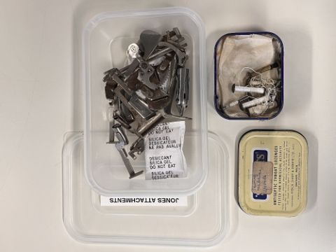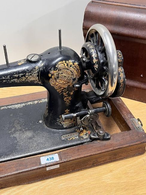 A vintage Jones Family hand-crank sewing machine with spare spools and attachments, in mahogany case.