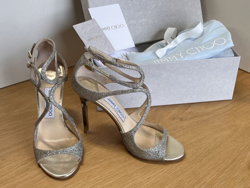 A pair of Jimmy Choo wedding shoes in all-over silver glitter with silver leather footbed, stiletto heel, comes in box with 'something blue' cloth bag and care guide pamphlet, size 37, light signs of wear to soles.
