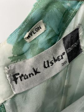 Four vintage floral dresses, of which three 1950-60s mid-century, to include Emenson azure blue nylon gown with Grecian style draping and all over cream floral embroidery, a Frank Usher sheer nylon layered wrap dress in pint with jade green painterly floral pattern, a handmade cocktail dress in olive floral with bust detail, and a modern Emilia Wickstead cotton dress in white with pink and green rose pattern, all size M.