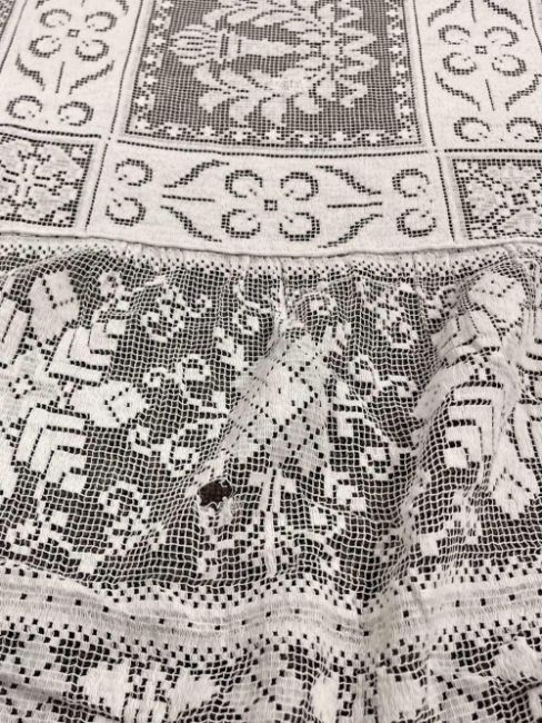 Two 19th century vintage net lace crochet bedspreads, one cream with rose motif and central circular medallion and border, measures 98 x 94 inches approximately, has some damage to one side, the other in white with grid of floral design, measuring 64 x 70 inches with a 10 inch frill drop edge.