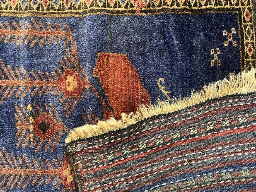A vintage knotted Afghan prayer rug featuring an eagle and feathers motif, in rich red and navy, measures 34 x 55 inches.