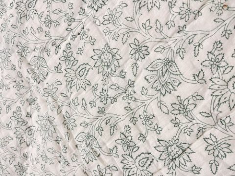 Two vintage OKA Indian cotton quilts or throw blankets, in super soft off-white and block-printed by hand with an all-over green foliate boteh pattern, single bed size, in lovely condition, some signs of age to the fabric such as creasing and crinkling, no major flaws.