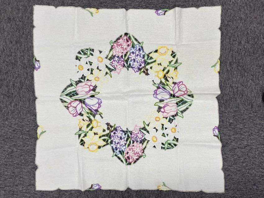Three antique and vintage tablecloths, to include white cotton lace crochet, cut out and embroidered examples, in lovely condition, each measuring approximately 32 x 34 inches.