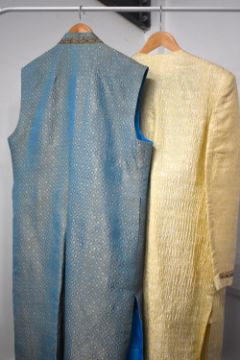 A collection of ornate Arabic men's wedding suit pieces, comprising an ankle length Sherwani waistcoat in turquoise and gold brocade, a champagne-cream brocade long-sleeved Sherwani floor length jacket, both intricately embroidered all over and with fine beading at the lapels, a cream shirt, turquoise and gold crochet scarf, cream crochet skull cap, and a pair of elaborately beaded Mughal / Moorish curled toe shoes, all in lovely condition, like new.