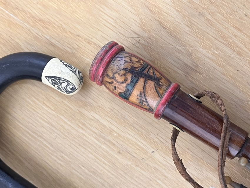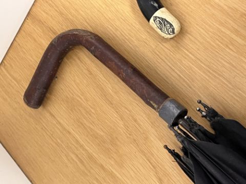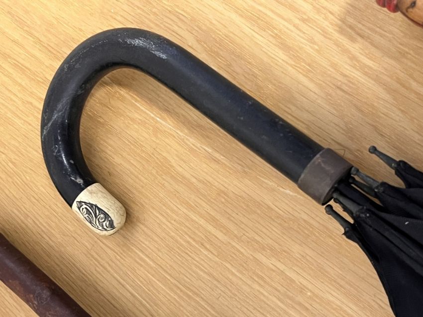 Three antique and vintage mourning umberellas, a British Made with leather covered handle and engraved bone tip along with two wood handled examples.