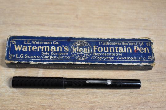 A boxed Waterman Ideal 12 lever fill fountain pen in chaised Black Hard Rubber having Watermans Ideal New York nib