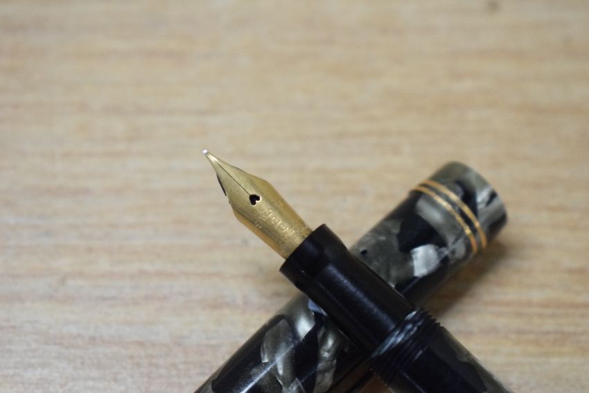 A Mabie Todd & Co Swan austerity pen no imprint number WWII, lever fill fountain pen in Black and Grey marble with two narrow cap bands having Swan 2 G 14C-585 Mabie Todd & Co Ltd Made in England nib