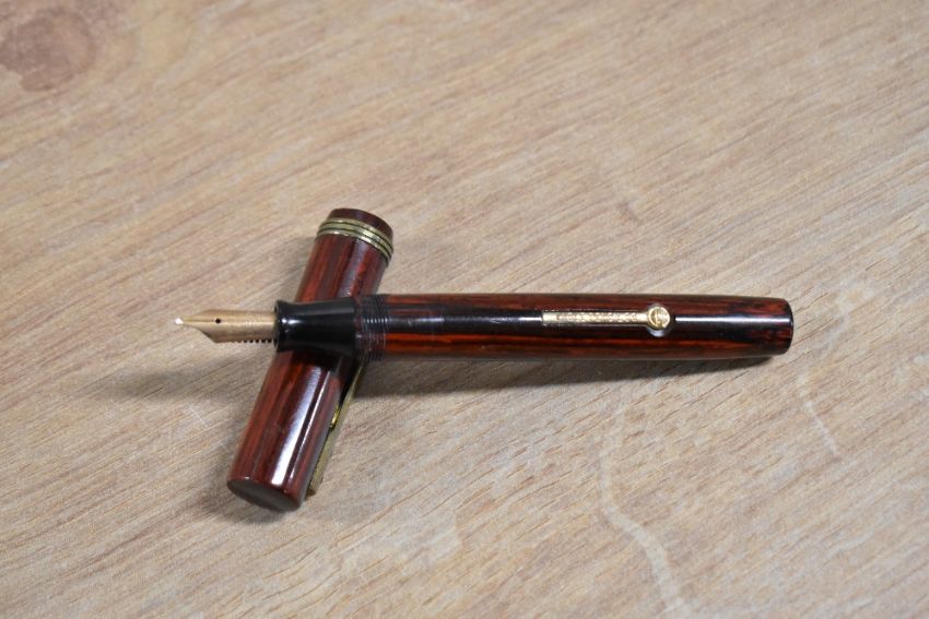 An Eagle Pencil Co USA lever fill fountain pen in Red and Black woodgrain with single band flat cap having Parker 14K England 25 nib