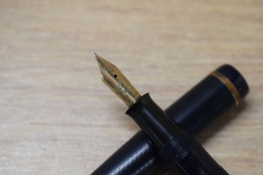 A Summit lever fill fountain pen in Black engine turned design with single narrow cap band having Summit 14CT Gold nib. Missing a band from top of the cap