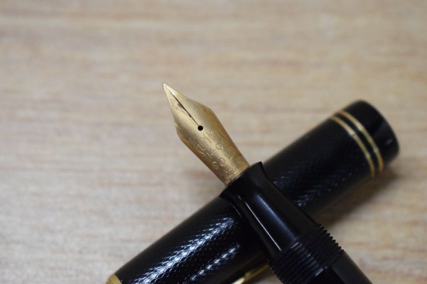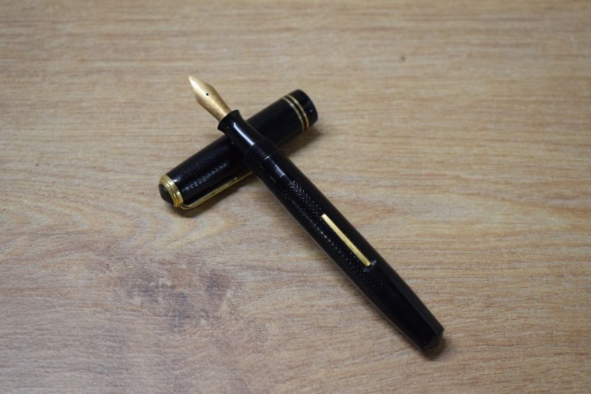 A Summit S175 lever fill fountain pen in Black engine turned design with two narrow cap bands having Summit 14CT Gold Made in Englandnib.