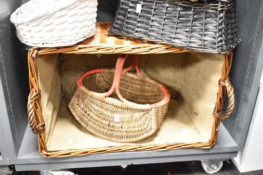 A selection of vintage wicker baskets of varying shapes and sizes, to include picnic baskets and storage baskets; sold with an early 20th-century handmade traditional British teddy bear, dressed in a hand-knitted red and blue sweater with grey fabric trousers, and a Gund Classic Pooh ‘My First Pooh Bear’ soft toy, featuring buttery soft yellow fur in the style of Ernest H. Shepard’s original illustrations, (6 baskets and 2 teddy bears), condition consistent with age and use, the handmade teddy well loved.