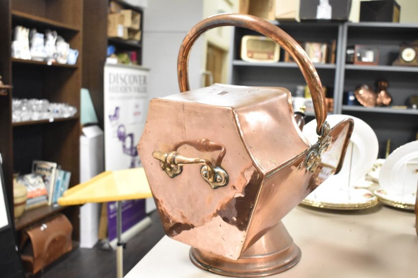 A 19th century copper coal scuttle, of angular form with swing over handle, rolled rim and spreading moulded circular foot, 30cm x 42cm sold with associated shovel, slight joint damage to canopy.