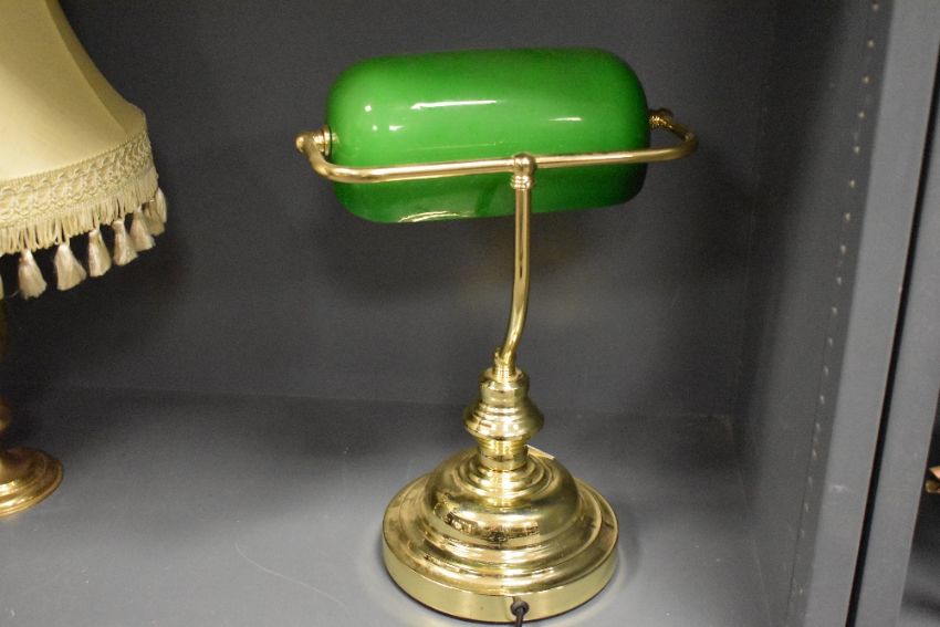 A contemporary Bankers Desk Lamp by Artech lighting, featuring a green glass shade and gilt metal stand, marked to base, approximately 38cm tall, condition is consistent with age and use, slight surface dust consistent with storage, PAT tested, sold as seen.