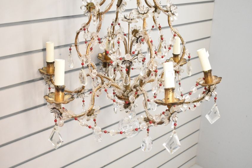 A fine late 19th-century to early 20th-century French Louis XV-style birdcage chandelier, featuring a scrolling gilt metal frame, lavishly hung with heavy ornate glass decorations, including crystal drops, dainty red beads, and rosettes, with interspersed glass floral motifs, having six flower-shaped sconces, unmarked, approximately 74cm from the top to the lowest hanging drop, condition is consistent with age and use, showing expected wear commensurate with period.