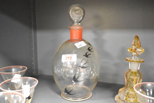 A selection of late 19th to 20th-century glassware, to include a glass box having an engraved ‘S’ in Gothic-style script; a 19th-century Bohemian engraved amber perfume bottle, featuring alternating panels of etched amber glass floral and foliate detailing; and an Art Deco–style hand-painted glass decanter set, featuring a selection of swallows, all unmarked, (8 pieces), condition consistent with age and use, with a small chip to one rim of the decanter glass set and to the inside of the rim of the box.