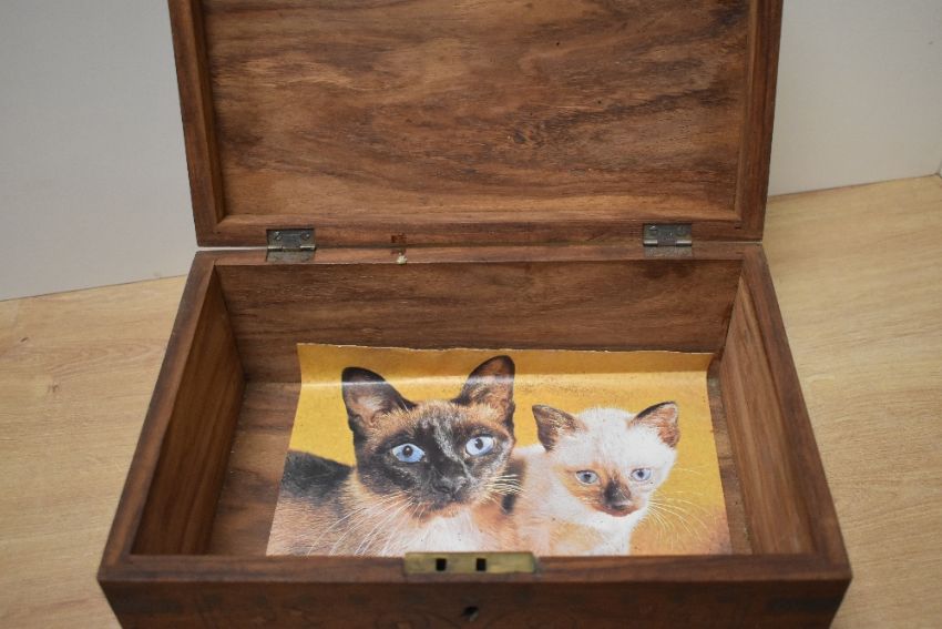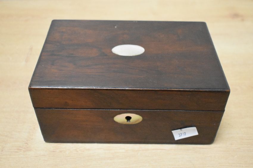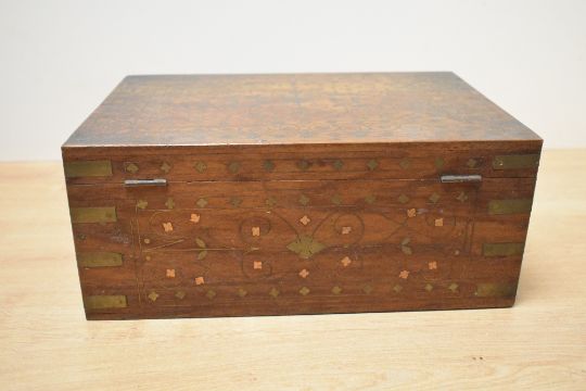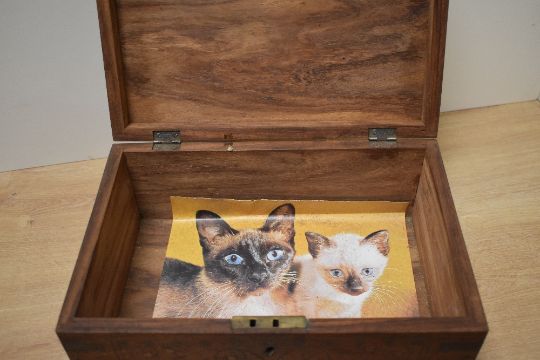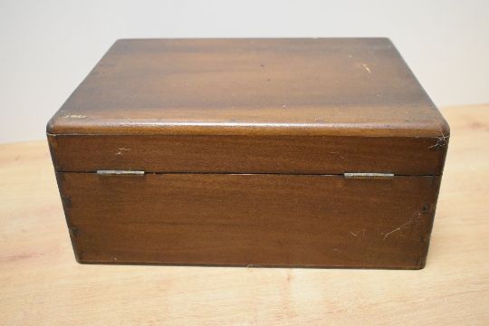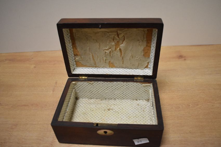 A group of four 20th century wooden boxes, one featuring elaborate inlays and cross bandings in it's design, largest measures 31cm x 23cm x 13cm, condition consistent with age and use.