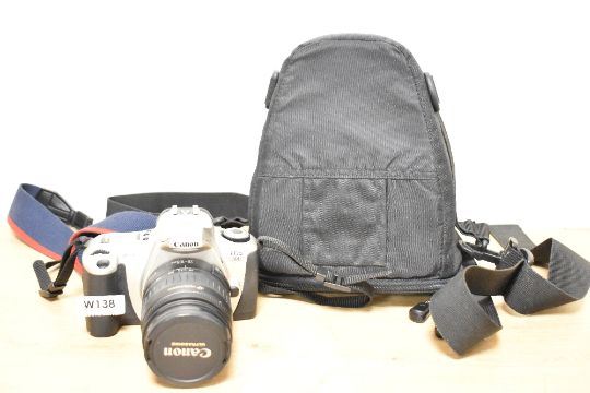 A Canon EOS300 camera with Canon Zoom EF 28-105mm 1:4-5,5 lens in soft camera bag