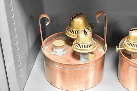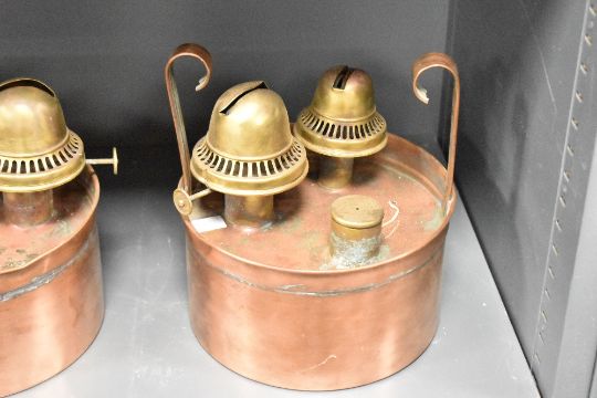 Three late 19th to early 20th-century British copper and brass double burner oil lamps, often used as chicken brooders to provide warmth, also in greenhouses and outhouses, marked 'British Made', (3), condition is consistent with age and use.
