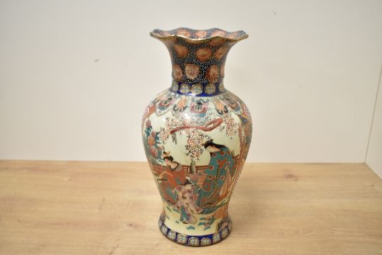 An early 20th-century Japanese Satsuma-style porcelain vase, of baluster form with a scalloped trumpet-shaped rim, having moriage ware detailing of figures, floral and foliate motifs, marked to base, 30cm, condition is consistent with age and use, no visible cracks, chips or fixed damage.