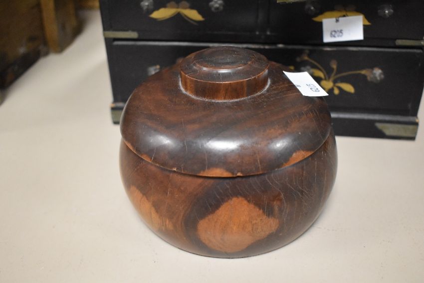 An Oriental black lacquer table cabinet featuring decorative bird and floral motifs, metal bound with two panelled cupboard doors enclosing an arrangement of six drawers over a long drawer, four of the draws lacking handle measuring 23cm x 10cm x 24cm overall, sold together with a similar decorative black lacquered four-panel folding tabletop screen depicting hand painted garden scenes measures 39.5cm tall.