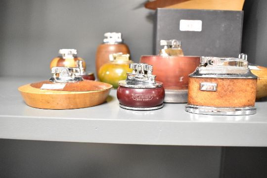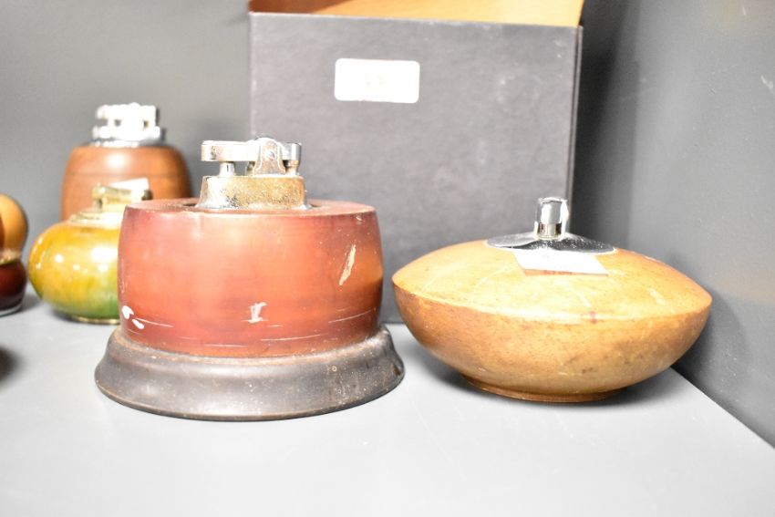 A quantity of 20th-century wooden table lighters, to include both Rolstar and Ronson examples, featuring a novelty boat form, most marked to base but not all, (10 pieces), condition is consistent with age and use, sold as seen.