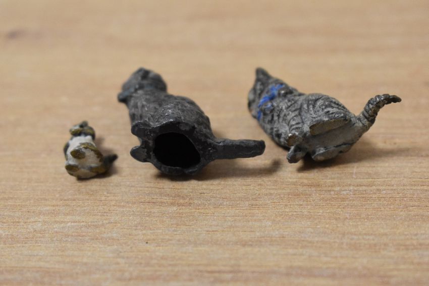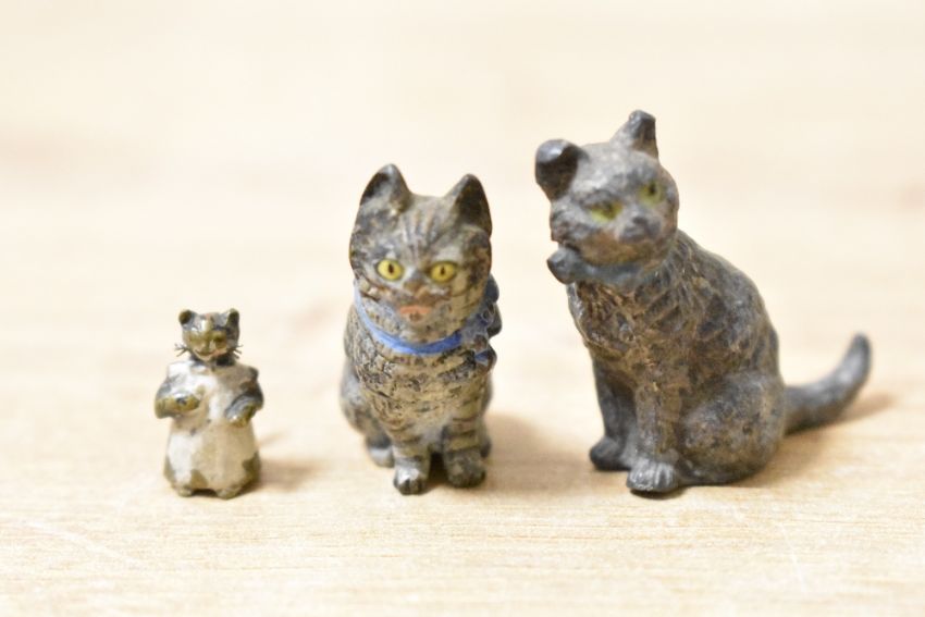 Two presumed 19th to early 20th-century Austrian bronze cold-painted cats of miniature proportions; sold with a thought to be painted spelter example, having green eyes and a blue bow, all unmarked, smallest is 1.5cm in height, then 2.5cm and the tallest is 3cm,(3), condition is consistent with age and use, visible areas of paint wear