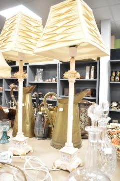 A pair of decorative Neo Classical style column table lamps with silvered and gilt embellishment, sold together with a brushed metal table lmap and Chinese style baluster table lamp, each with shade and PAT tested.
