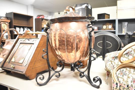 A Victorian Arts & Crafts copper and wrought-iron coal bucket, of globular fluted form with conical circular lid with handle, all within three scrolled wrought-iron supports, 59cm x 51cm