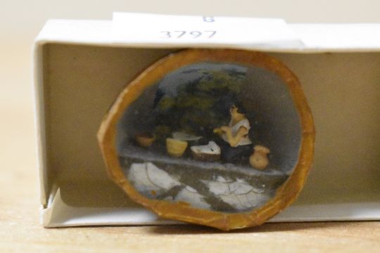 A 19th-century miniature walnut diorama, featuring a hinged walnut that opens to reveal a farming scene of fruits, foliage and a traditionally dressed male farmer figure, with gilt detailing to flowers; sold with a 20th-century one sided example, featuring a female figure in an outdoor setting and having a clear covering, both approximately 3cm each walnut half, (2), condition is consistent with age and use, sold as seen.